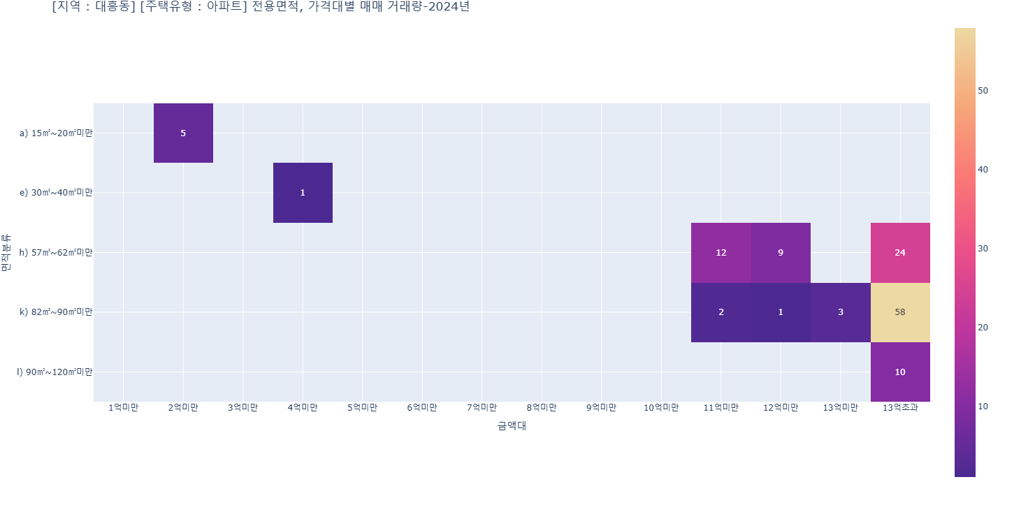 (2) 대흥동-전용면적, 거래가격대별-매매 거래량(2024년)