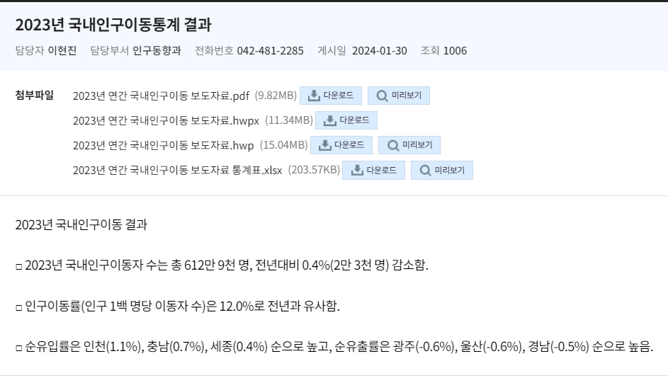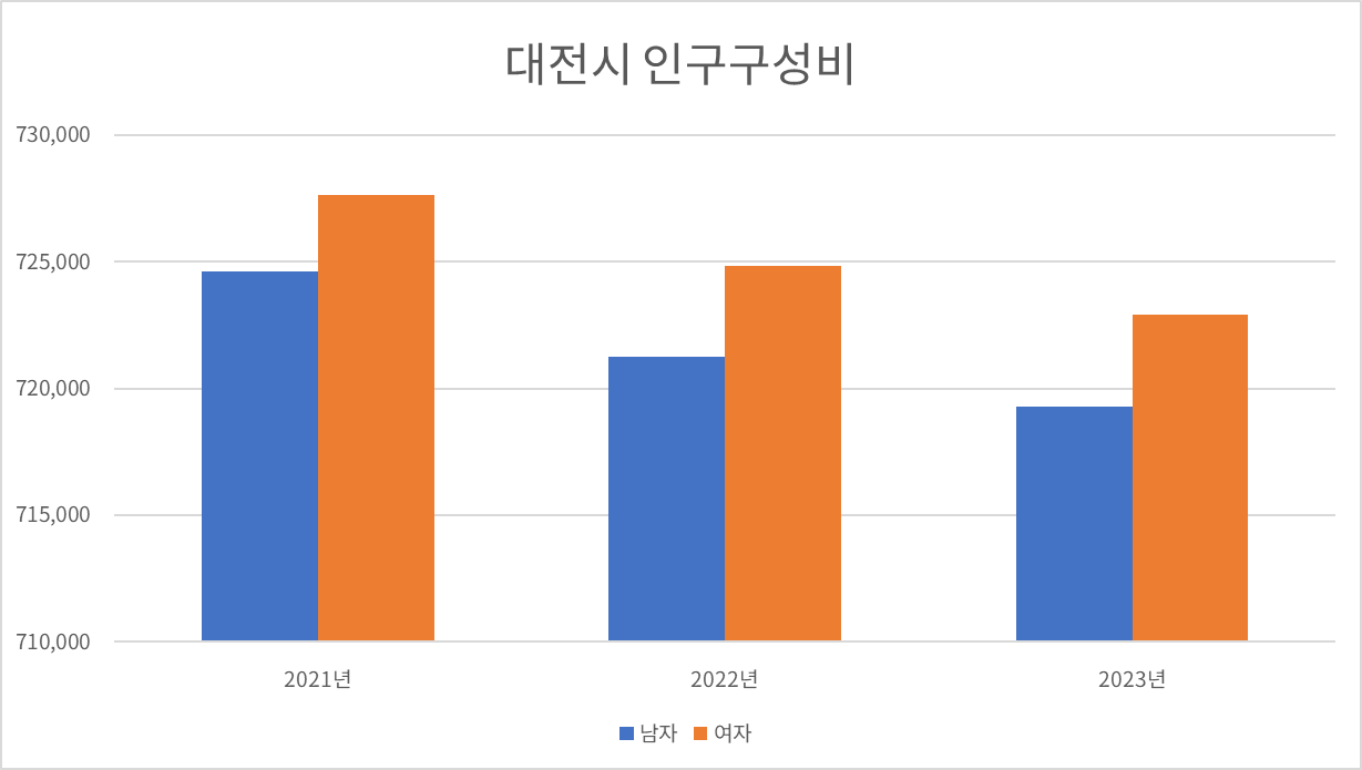 대전광역시 아파트 거래량 및 거래가격 통계에 있어서 장래적인 전망과 현재를 살피는데 필요한 통계청의 행정구역별 인구수 통계를 작성하여 대전시 정보를 작성할 때, 링크를 통해서 공유하는 정보로 사용한다. 1. 대전광역시 총인구와 성별 인구수 적은 수이긴 하지만, 2021년부터 지속적으로 인구가 감소하고 있다. 인근 세종시로 이사한 것일 수 있으나, 2021년 대비하여 1만명이 넘는 인구가 감소한 모습이다. 대전 도심에서 이탈한 것일 수 있겠다. 실제로 충북의 인구는 감소했으나, 세종시와 충남의 인구는 2021년 대비해서 2023년 증가하는 모습을 보였다. (첨부1. 충북,충남,세종인구) 연도 2021년 2022년 2023년 총인구 1,452,251 1,446,072 1,442,216 남자 724,626 7..