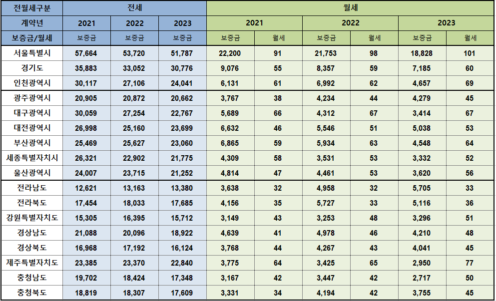 2023년 10월 말 자료를 기준으로 전국의 아파트 전세보증금, 월세보증금, 월세의 평균과 중위가격을 3년 치의 변동내역을 살펴보고 전국적으로 평균 전세가격은 낮아지고, 월세액은 증가하는 것을 확인. 1. 전국 아파트 전세보증금, 월세보증금 평균가격 분석 자료기준일 : 2023년11월5일 ( 2021년, 2022년, 2023년 10월까지의 전국월간통계 합산 ) [1] 전국 현황 전국 아파트의 연도별 전세보증금은 2021년 기준 하락하고 있음. 전국 아파트의 연도별 월세보증금은 2021년 기준 하락하고 있음. 전국 아파트의 2021년 기준 월세는 증가하고 있음. [2] 전국 증감율 및 특이점 2021년 대비 2023년의 전세금(전세보증금), 월세금(월세보증금), 월세 증감률 세종시 지역의 아파트만 월세평균..